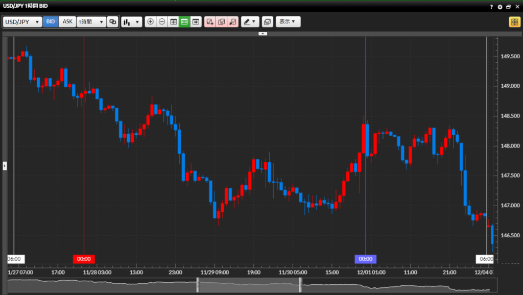 トレード分析:今週は14日4時よりアメリカのFOMC(連邦公開市場委員会)があった。長期金利につては市場の予想通り5.25%。しかし、来年の利下げ回数について、Fedwatchでは6回を見込んでいるが、発表されたものは3回予測。市場との乖離が見える結果となった。この発表をきっかけに一時145.2円から141円まで約420pips下げることとなったその後は142円台まで戻したものの142円前後のレンジ相場となっている。今週で今後の大局はドル安円高が確定。対局への順張りを基本としたトレードをしてゆく。そんな中での今週のとレートは久しぶりの大負け。内容はポジポジ病です。最大の勝ちトレードは32pipsと取れているのだが、負けトレードの回数が今週の全トレード113回中56回。ほぼ勝ちトレード回数と同数なのだが、勝ちトレードpips平均(約4.2pips)が負けトレードpips平均(約5.7pips)を1.5pips下回っている。損大利小トレードになっているという事。トレードについて環境認識をもっと意識して勘定に負けたトレードを減らしていくことが大切だ。