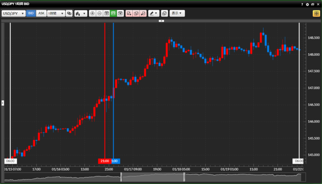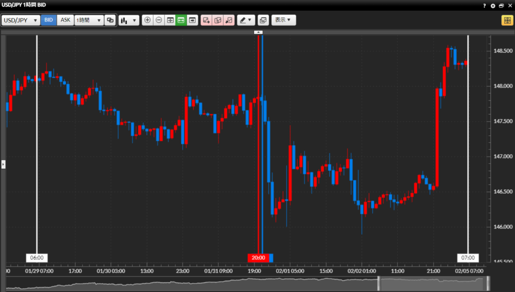 トレード分析:今週はアメリカの休場(2/19)や日本の祝日(2/23)があり、実質的な稼働日が少ない週となりました。大きな経済指標も特になく、アメリカの長期金利動向に沿った値動きを示した週でした。2/22に発表のあったアメリカ新規失業保険申請者数等の指標は軒並み予想を下回っており、アメリカ経済の順調ぶりを示すものでした。2024年に入ってからのドル円はドル高円安トレンドが継続しおり、今後の目安は直近では2月高値の150円79銭のラインを超えてくるかどうか、また、昨年11月の高値の151円71銭を超えてくるかどうか。そのあたりまで来ると日銀の為替介入の可能性が高まってくるが、ここ2年の間に3発ほど為替介入を打ってきて、その効果が徐々に弱まってきている。今回も為替介入をしてきても果たして前回の10円も下げる威力があるのかどうか。すべてはアメリカ経済の動向や日銀のマイナス金利解除といった大きなファンダメンタルとどれだけ絡めることが出来るかで変わってくる。大局がドル高円安の今、為替介入をしても効果は限定的なものとなる可能性が高いように思われる。こんな相場状況の時は大局に沿ったトレードでテクニカルを活かしたものをコツコツ積み重ねたトレードで利益を積み重ねていきたい。そんな今週のトレード結果は勝ち越し週となった。トレード回数は2回と少なく、アメリカ長期金利に沿ったテクニカルトレードを行ったもの。先に述べた高値ラインを超えてくるまではコツコツトレードが続きそうだ。