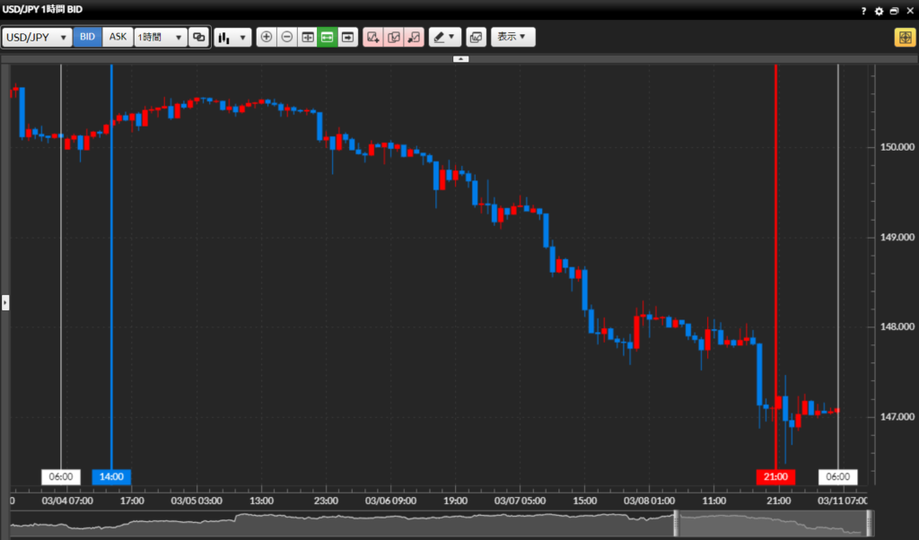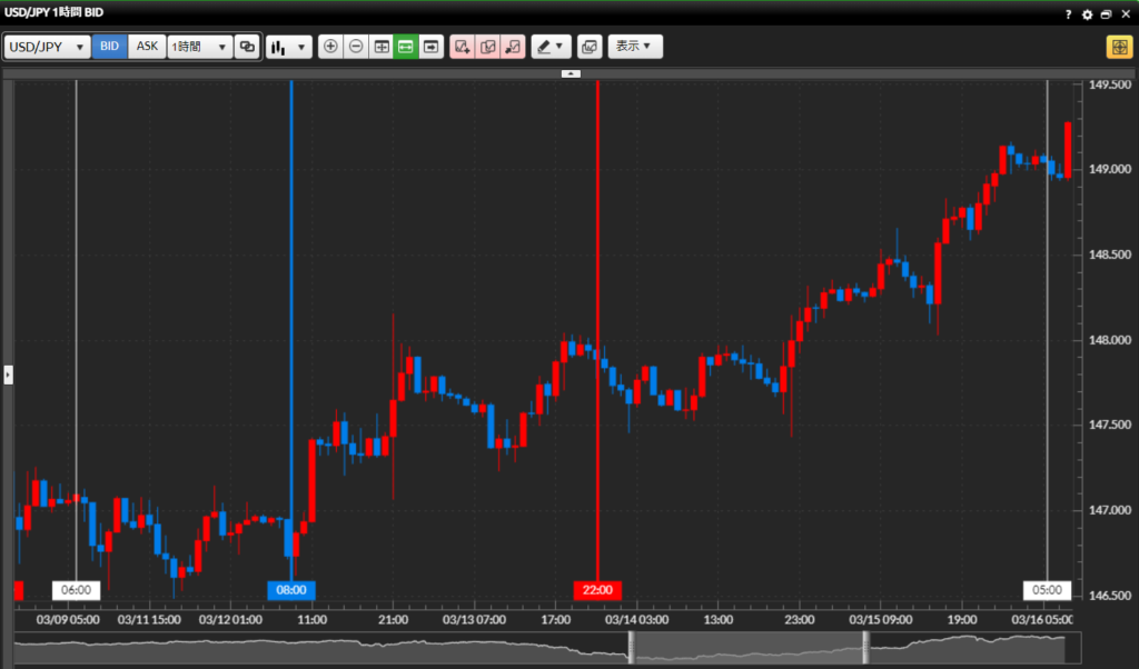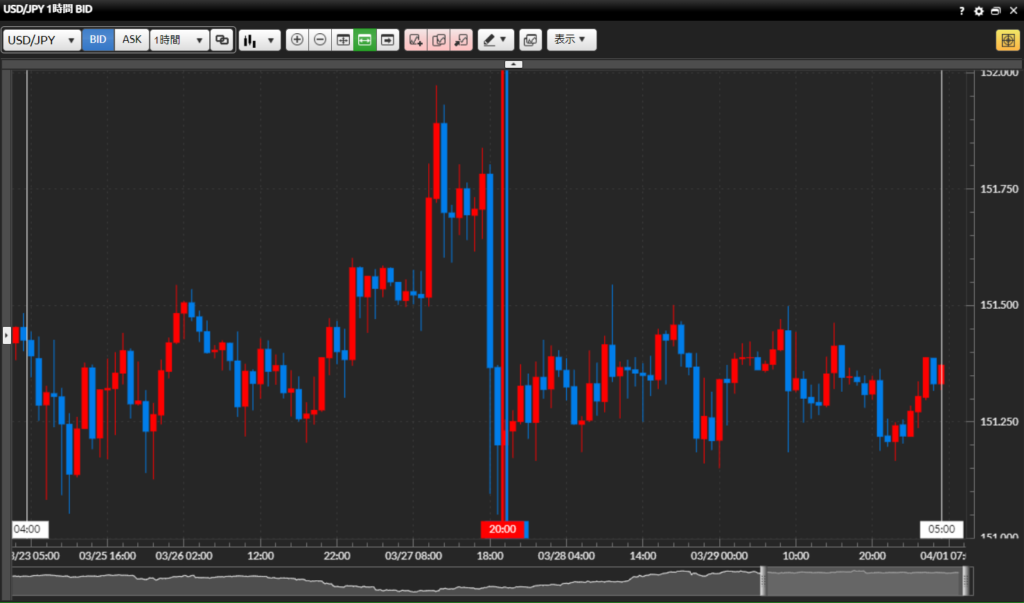 トレード分析:年度末となる今週。値動きは約30pipsほどの中でレンジ相場。ファンド等の大口も今の時期は積極的なトレードは避け年度の利益確定に動く時期。そんな中、マイナス金利解除を行ったが、想定以上に円安方向への為替相場に日銀さんあれれって感じでしょうか。3月27日に日銀審議委員による金融緩和継続発言によりますます円安へ。一時152円まであと3pipsというところまで進み、慌てて同日に財務省・金融庁・日銀の3者会合開催。それを受けて50pipsほど円高に。為替介入するなら早くしてほしいな。大口も介入後の押し目買い狙いかな。何せ今の相場は大局は円安、でも為替介入警戒で上値が抑えられている状況。そんな中での今週の最大トレードは散々です。今週は負け週となり、改めてレンジ相場でのトレードの難しさと手を出すもんじゃないと自分への戒めの週となりました。