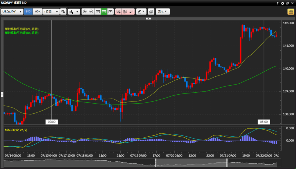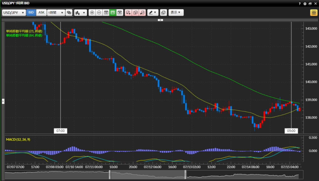 トレード分析:7月17日の19時~23時の間の約100pipsの上昇トレンド内でのトレード。4時間かけて100pips上昇したが、損切5pips設定の私は小刻みでのトレードを繰り返し、その中で約16pips獲得のトレードがあった。6月30日につけた1ドル145円からの円高の流れが、ようやく先週7月14日で底を打ち、今週に入って円安に動き出した。不安定な相場となる事が見られるようになり、FXを始めて初めて負け越した日を経験した。自分の資金が減るという事を始めて経験した。負け越しているときのトレードはテクニカル分析も薄く、値ごろ感だけでのトレードを繰り返してしまった。当然そのようなトレードでは結果は出ない。この2週間調子が良かったことで気が緩んでいたのだろう。調子がいい時も悪い時もどちらも安定した気持ちでトレードする事が大切だと感じた。